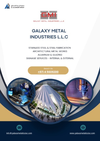 GALAXY METAL INDUSTRIES L.L.C STAINLESS STEEL & STEEL FABRICATION ARCHITECTURAL METAL WORKS ALUMINUM & GLAZING SIGNAGE SERVICES - INTERNAL & EXTERNAL Reach Us +971 4 5609200 info@galaxymetaldubai.com www.galaxymetaldubai.com